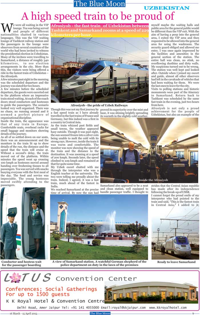We were all waiting in the VIP lounge. Tea was being served and people of different nationalities chatted in various languages. This was the VIP waiting lounge of Tashkent railway station and the passengers in the lounge were observers from several countries of the world who had been invited to witness the presidential election in Uzbekistan. Many of the invitees were travelling to Samarkand, a distance of roughly 340 kilometres, to see election arrangements in the city. More than this, the visitors were being offered a ride in the fastest train of Uzbekistan – the Afrosiyob.