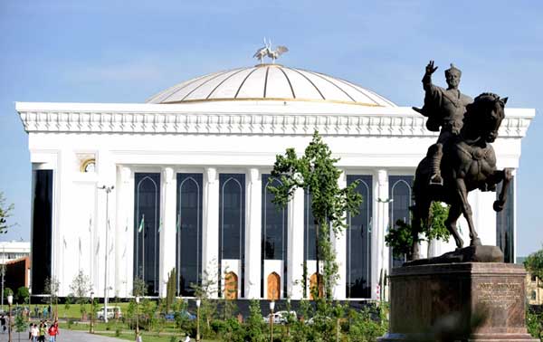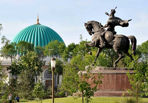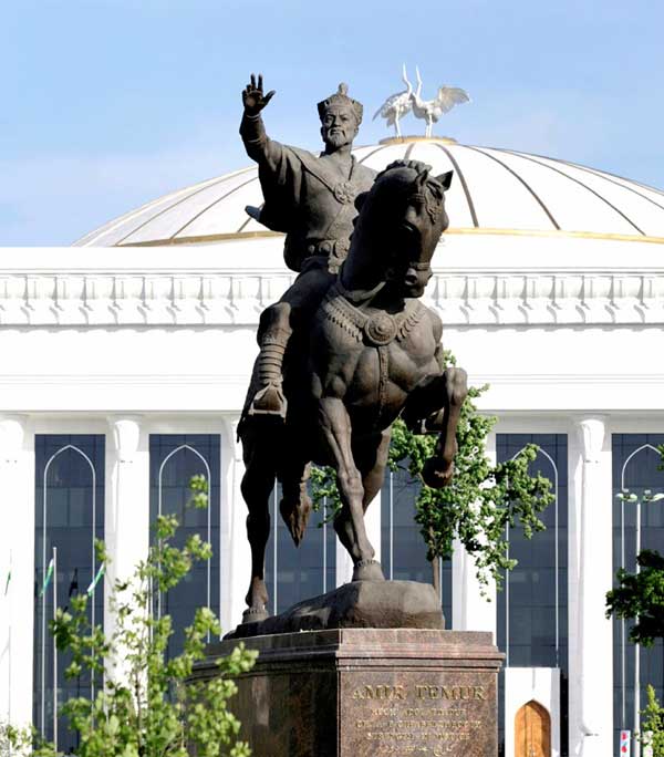 In the center of the square is a bronze monument to Amir Temur, the great statesman and military leader.