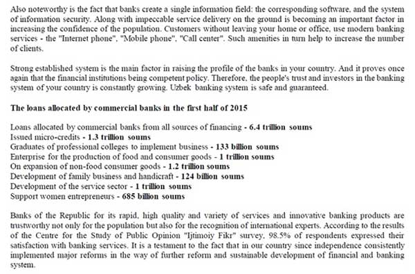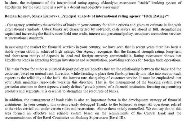 From the first years of independence in our country focuses on the formation of an economy based on market relations, and the establishment of financial and banking system, which is considered its blood vessels. This is the main point of reference developed by the Head of State and internationally recognized “Uzbek model” of development. Efficiency is manifested in the huge achievements in all sectors of the economy.
